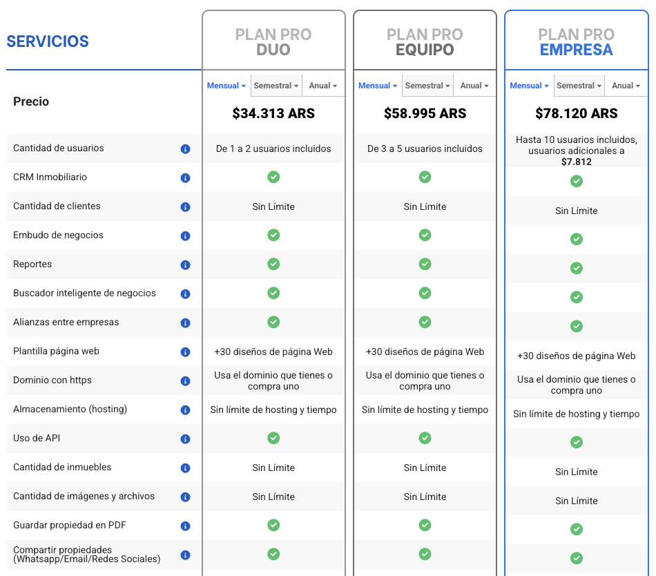 2clics ofrece 3 planes para utilizar su plataforma, los mismos son libres en cuanto a cantidad de propiedades. A continuación en la imagen puede ver los costos mensuales, pero en el caso de abonar un año adelantado puede obtener un 17% de descuento.